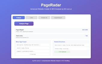 PageRadar, Chrome tarayıcısı için geliştirilmiş ücretsiz bir eklentidir. Bu araç, web sayfalarının yapısını analiz etme imkanı sunarak, sayfa ağırlığı, iç ve dış bağlantılar ile rel özniteliklerini (nofollow/ugc/sponsored) inceleme gibi özellikler içerir. Ayrıca, meta etiketler ve X-Robots-Tag direktiflerini denetleyebilir, özel robots.txt kurallarını yönetebilir ve verileri CSV formatında dışa aktarıp içe aktarabilirsiniz. Tüm bu özellikler çevrimdışı olarak çalışmaktadır.